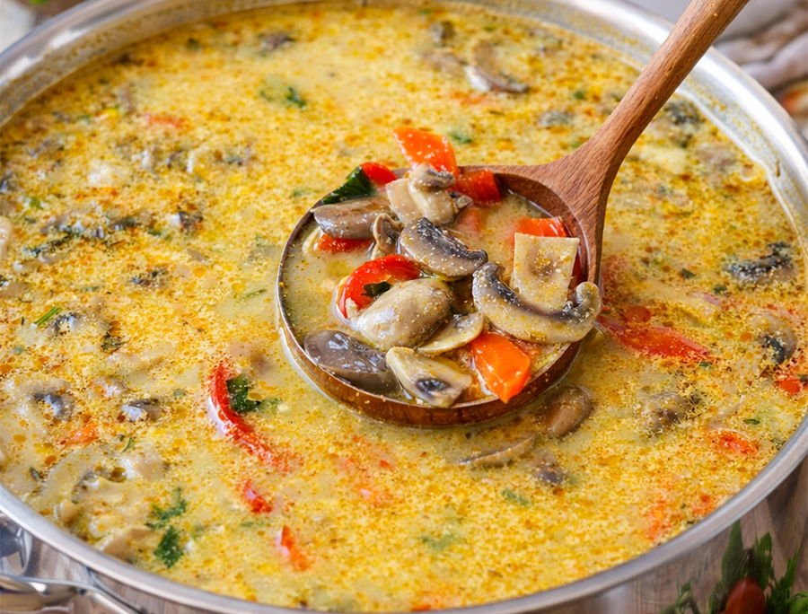 Sekretem tej zupy jest serek topiony, który po rozpuszczeniu nadaje jej kremową konsystencję i łagodny, śmietankowy smak. W połączeniu z aromatycznym bulionem, podsmażonym kurczakiem i warzywami tworzy zupę, która jest jednocześnie delikatna i wyrazista.